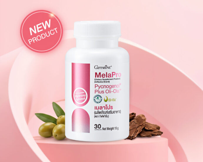 อาหาร “Giffarine  MelaPro” (กิฟฟารีน เมลาโปร) ครั้งแรกของการรวมพลัง 2 สารสำคัญที่สกัดจากธรรมชาติ ที่มีงานวิจัยรับรองถึงประสิทธิภาพในการดูแลผิวในเรื่องฝ้าแบบ multi-mechanistic ผสานพลังจาก PYCNOGENOL® สารสกัดจากเปลือกสนมาริไทม์ฝรั่งเศส และ OLI-OLATM สารสกัดจากมะกอก ช่วยส่งผลดีต่อการ balance ความเข้มของเม็ดสีผิว ความชุ่มชื้น และความยืดหยุ่น
