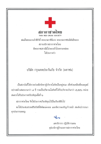 บริษัท กรุงเทพประกันภัย จำกัด (มหาชน) ได้รับใบประกาศเกียรติคุณชั้นที่ 2 จากสภากาชาดไทย ในฐานะองค์กรที่ให้การสนับสนุนและความร่วมมือในการจัดหาผู้บริจาค