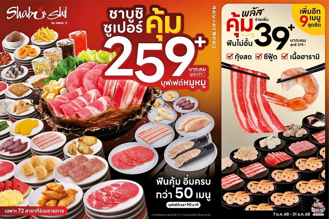 ขณะเดียวกัน ชาบูชิ ยังคงให้บริการบุฟเฟต์ “สุขอิ่ม” 399 บาท+ สำหรับลูกค้าประจำที่ต้องการประสบการณ์เต็มรูปแบบ ทั้งชาบู – ชาบู ซูชิ และเมนูอาหารรับประทานเล่น เช่น กุ้งเทมปุระ ตลอดจนผลไม้ ไอศกรีม และเครื่องดื่ม รวมกว่า 70 รายการ พร้อมให้บริการแล้วกว่า 72 สาขาทั่วประเทศ ที่ ชาบูชิ สาขาในไฮเปอร์มาร์เก็ต ครอบคลุมทำเลหลัก เช่น บิ๊กซี, โลตัส และคอมมูนิตี้มอลล์ต่าง ๆ (ดูสาขาที่ร่วมรายการ คลิก https://oishifood.com/page/shabushi-buffet259) ตั้งแต่ 7 ตุลาคม 2568 – 31 ธันวาคม 2568 เพื่อกระตุ้นกำลังซื้อและสร้างความคึกคักให้ตลาดร้านอาหารช่วงปลายปี