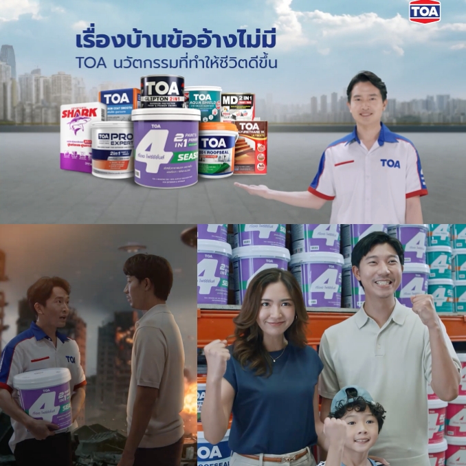 บริษัท ทีโอเอ เพ้นท์ (ประเทศไทย) จำกัด (มหาชน) หรือ TOA ผู้นำนวัตกรรมสี – เคมีภัณฑ์ก่อสร้างของไทย ตอกย้ำ เจ้าตลาดเบอร์ 1 – กับกระแสครั้งใหญ่ หลังปล่อยแคมเปญการตลาดชุดใหม่ ‘เรื่องบ้านข้ออ้างไม่มี – No More Excuse’ สร้างความฮือฮาในโลกออนไลน์ ด้วยแนวคิดที่สะท้อน insight ความจริงของผู้คนที่มักมีข้ออ้างในการดูแลบ้าน ผ่านหนังโฆษณาวันสิ้นโลก จนกลายเป็นไวรัลดัง ทำยอดวิวทะลุ 1 ล้านวิว ภายในสัปดาห์แรกที่เปิดตัว