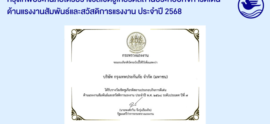 กรุงเทพประกันภัยรับรางวัลเชิดชูเกียรติ “สถานประกอบกิจการดีเด่น ด้านแรงงานสัมพันธ์และสวัสดิการแรงงาน ระดับประเทศ” ต่อเนื่องเป็นปีที่ 7