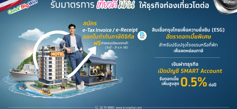 ธนาคารกรุงไทยขานรับมาตรการดังกล่าว จัดเต็มสิทธิพิเศษสำหรับผู้ประกอบการที่สมัครใช้บริการ “Krungthai e-Tax Invoice / e-Receipt” ฟรีค่าธรรมเนียมแรกเข้า พร้อมค่าธรรมเนียมต่อรายการในอัตราพิเศษ และรับตราสัญลักษณ์ “E-TAX INVOICE & RECEIPT” ตามที่กรมสรรพากรกำหนด ด้วยบริการ “Krungthai e-Tax Invoice / e-Receipt” ที่ช่วยให้ผู้ประกอบการทุกขนาด ทั้งโรงแรม โฮมสเตย์ ร้านอาหาร และธุรกิจนำเที่ยว สามารถออกใบกำกับภาษีอิเล็กทรอนิกส์ได้อย่าง สะดวก ปลอดภัย และลดต้นทุน โดยธนาคารได้รับการรับรองจากสำนักงานพัฒนาธุรกรรมทางอิเล็กทรอนิกส์ (ETDA) และกรมสรรพากรให้เป็น ผู้ให้บริการ e-Tax Service Provider ระดับสูง (Advanced) ซึ่งรับประกันมาตรฐานความปลอดภัย และความถูกต้องของข้อมูล ผู้ประกอบการสามารถตรวจสอบสถานะรายการใบกำกับภาษีอิเล็กทรอนิกส์ได้ตลอด 24 ชั่วโมง ผ่าน Krungthai e-Tax Portal เพื่อเสริมความมั่นใจในทุกขั้นตอนของการทำธุรกิจ