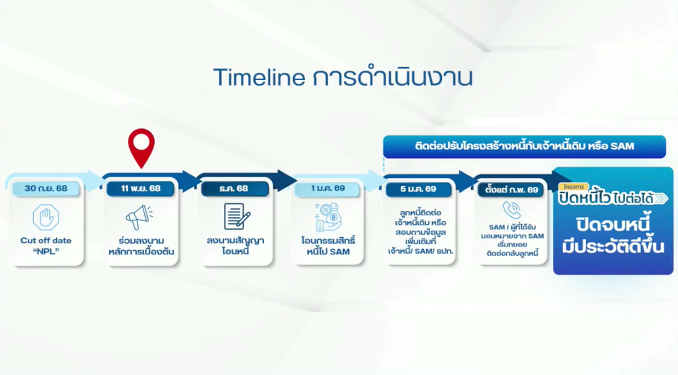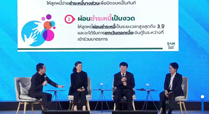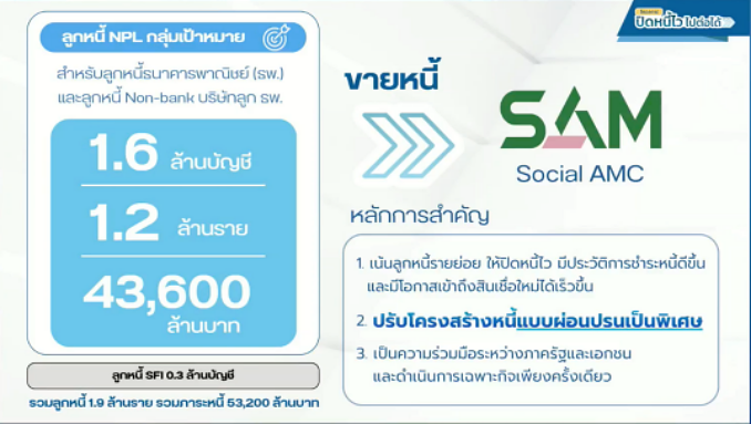 กระทรวงการคลัง ธปท. และภาคสถาบันการเงิน จึงร่วมกันดำเนินโครงการแก้ปัญหาหนี้เสียผ่านกลไกการซื้อหนี้รายย่อยของบริษัทบริหารสินทรัพย์ (Asset Management Company: AMC) ขึ้น ภายใต้ชื่อ “ปิดหนี้ไว ไปต่อได้” การช่วยเหลือในครั้งนี้เป็นมาตรการเฉพาะกิจที่จะดำเนินการเพียงครั้งเดียว โดยเน้นหนี้เสียที่ไม่มีหลักประกัน ซึ่งกลุ่มเป้าหมายคือลูกหนี้รายย่อยที่มีภาระหนี้ที่ไม่ก่อให้เกิดรายได้ (Non-Performing Loans: NPLs) ทุกประเภทสินเชื่อกับผู้ให้บริการทางการเงินทุกแห่งรวมกันไม่เกิน 1 แสนบาทต่อราย ณ วันที่ 30 กันยายน 2568 ซึ่งในระยะแรกจะครอบคลุมลูกหนี้ของธนาคารพาณิชย์และบริษัทในกลุ่มธุรกิจทางการเงินของธนาคารพาณิชย์จำนวนประมาณ 1.6 ล้านบัญชี หรือ 1.2 ล้านราย ภาระหนี้ประมาณ 43,600 ล้านบาท โดยบริษัท บริหารสินทรัพย์สุขุมวิท จำกัด (SAM) จะรับซื้อหนี้ของลูกหนี้กลุ่มเป้าหมายข้างต้น เพื่อนำมาปรับโครงสร้างหนี้แบบผ่อนปรนเพื่อให้ลูกหนี้กลับมาจ่ายชำระหนี้ได้ โดย ธปท. จะปรับยุทธศาสตร์ให้ SAM เป็นบริษัทบริหารสินทรัพย์เพื่อสังคม (social AMC) ที่มุ่งเน้นช่วยแก้หนี้ให้ประชาชนโดยไม่มุ่งหากำไร ซึ่งในระยะต่อไปจะพิจารณาขยายให้SAM รับซื้อหนี้จากผู้ให้บริการทางการเงินประเภทอื่นเพิ่มเติมด้วย