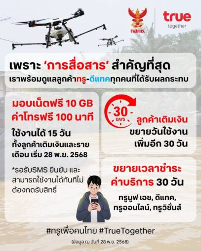 กรุงเทพฯ 29 พฤศจิกายน 2568 – เพราะการสื่อสารสำคัญที่สุด … ทรู ดีแทคขอแสดงความห่วงใยต่อผู้ใช้บริการทุกท่านที่อาจได้รับผลกระทบจากเหตุการณ์น้ำท่วมภาคใต้ที่เกิดขึ้น พร้อมตอกย้ำจุดยืนในการดูแลลูกค้าเป็นสำคัญ ด้วยความเชื่อมั่นว่า “การสื่อสาร” คือกลไกหลักที่เชื่อมโยงทุกคนเข้าด้วยกัน ทั้งในการใช้ชีวิตประจำวัน การทำงาน การติดต่อคนใกล้ชิด ตลอดจนการเข้าถึงข้อมูลและบริการที่จำเป็น
