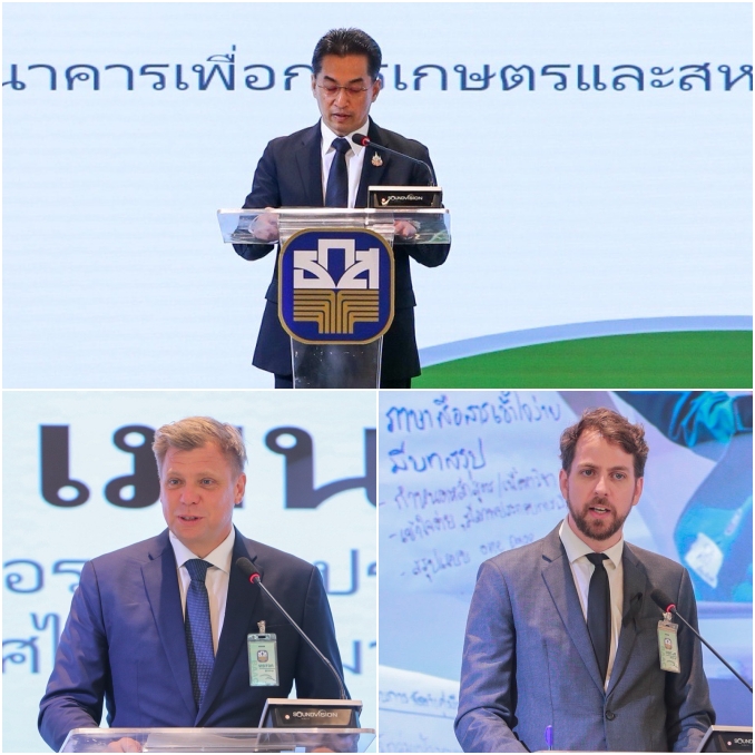 ทางด้าน ดร. ทีโม เมนนิเคน ผู้อำนวยการองค์กรความร่วมมือระหว่างประเทศของเยอรมัน (GIZ) ประจำประเทศไทย กล่าวเพิ่มเติมว่า GIZ มุ่งส่งเสริมการพัฒนาอย่างยั่งยืน ทั้งภาคเศรษฐกิจ และภาคการเกษตรด้วยการเสริมสร้างศักยภาพในการปรับตัวต่อการเปลี่ยนแปลงสภาพภูมิอากาศ เพื่อสร้างความเป็นอยู่ที่ดีของสังคมและสภาพแวดล้อม โดยเฉพาะภาคการเกษตรซึ่งถือเป็นหัวใจสำคัญเกษตรกรไทยมีบทบาทสำคัญต่อความมั่นคงด้านอาหารและเสถียรภาพทางเศรษฐกิจของประเทศ อย่างไรก็ตามเกษตรกรกำลังเผชิญความเสี่ยงจากการเปลี่ยนแปลงสภาพภูมิอากาศมากขึ้นตามลำดับส่งผลกระทบต่อผลผลิตรายได้และคุณภาพชีวิต ดังนั้นภายใต้ความร่วมมือระหว่าง GIZ ธ.ก.ส. และภาคีเครือข่าย ในโครงการต่าง ๆ จะช่วยเสริมสร้างทักษะและองค์ความรู้ทางการเงินให้กับเกษตรกร พร้อมกับเสริมสร้างศักยภาพในการรับมือกับความเสี่ยงด้านสภาพภูมิอากาศ เพื่อเป้าหมายสำคัญที่จะช่วยยกระดับคุณภาพชีวิตของเกษตรกรและช่วยให้เกษตรกรสามารถทำการเกษตรได้อย่างยั่งยืนต่อไป