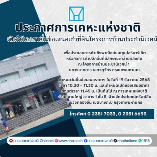 นายอรรคพล ภิรมย์ประดิษฐ์ ผู้อำนวยการฝ่ายจัดประโยชน์ทรัพย์สิน การเคหะแห่งชาติกล่าวว่า การเคหะแห่งชาติประกาศเปิดให้เอกชนยื่นข้อเสนอราคาการได้สิทธิเช่าพื้นที่ส่วนพาณิชยกรรม บริเวณชั้น 1 เพื่อประกอบการค้าเชิงพาณิชย์และซูเปอร์มาร์เก็ต หรือกิจการค้าปลีกอื่นที่มีลักษณะคล้ายคลึงกัน โครงการบ้านประชานิเวศน์ 1 โฉนดเลขที่ 2199 ขนาดเนื้อที่ประมาณ 1-0-75 ไร่ ตั้งอยู่บริเวณซอยเทศบาลนิมิตเหนือ 8 แขวงลาดยาว เขตจตุจักร กรุงเทพมหานคร เพื่อให้เกิดความโปร่งใสในการดำเนินงานทุกขั้นตอนตามหลักธรรมาภิบาล การเคหะแห่งชาติจึงเปิดโอกาสให้เอกชนที่สนใจสามารถยื่นข้อเสนอราคาการได้สิทธิเช่าที่ดินดังกล่าว โดยมีอัตราค่าธรรมเนียมการได้สิทธิเช่าขั้นต่ำ 5,800,000 บาท ระยะเวลาการให้สิทธิเช่า 15 ปี (ทำสัญญาคราวเดียว) ในอัตราค่าเช่ารายเดือน ปีที่ 1-3 เดือนละ 210,000 บาท (ปลอดค่าเช่า 3 เดือนแรก) ปีที่ 4-6 เดือนละ 250,000 บาท ปีที่ 7-9 เดือนละ 290,000 บาท ปีที่ 10-12 เดือนละ 340,000 บาท ปีที่ 13-15 เดือนละ 400,000 บาท กำหนดหลักประกันการยื่นซองเสนอราคาจำนวน 100,000 บาท กำหนดเงินประกันการปฏิบัติตามสัญญา จำนวน 1,200,000 บาท โดยกำหนดวันยื่นข้อเสนอราคาในวันที่ 19 ธันวาคม 2568 เวลา 10.30 – 11.30 น. และกำหนดเปิดซองเสนอราคา ตั้งแต่เวลา 11.45 น. เป็นต้นไป ณ การเคหะแห่งชาติ สำนักงานใหญ่ อาคาร 1 ชั้น 5 ฝ่ายจัดประโยชน์ทรัพย์สิน แขวงคลองจั่น เขตบางกะปิ กรุงเทพมหานคร