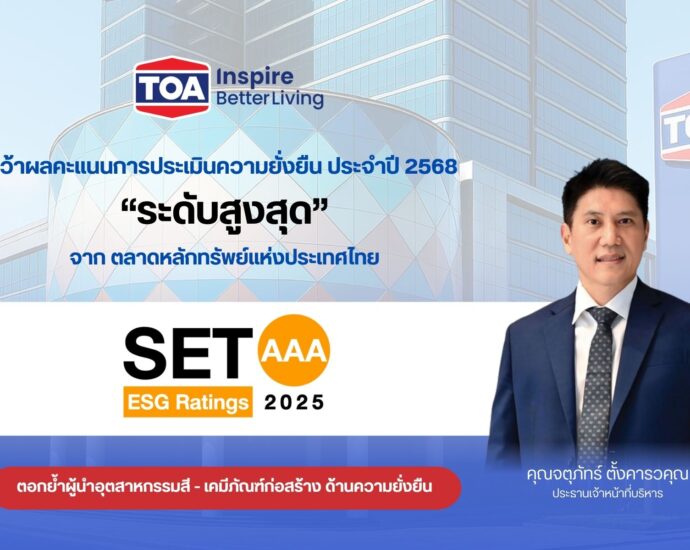 • TOA ยืนหนึ่งคว้าหุ้นยั่งยืน ระดับสูงสุด ‘AAA’ จากการประเมิน SET ESG Ratings ปี 2568ตอกย้ำผู้นำอุตสาหกรรมสี – เคมีภัณฑ์ พร้อมยกระดับสู่มาตรฐานความยั่งยืนระดับสากล