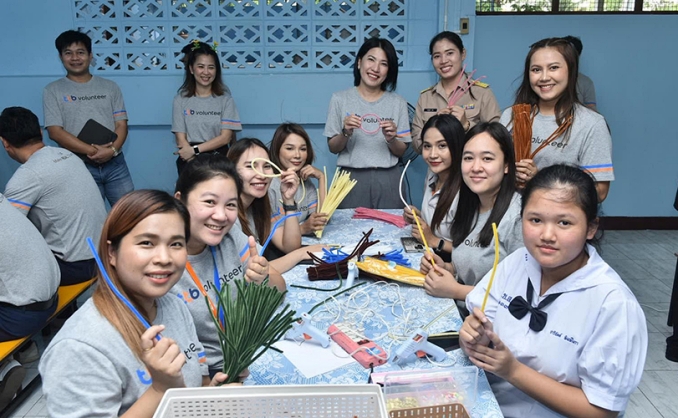 อีกเสียงสะท้อนจาก นายสรยุทธ รื่นเริง อาสาสมัครทีทีบี ทีมธุรกิจสินเชื่อรถยนต์ เขตสระบุรี จากโครงการ “ลวดกำมะหยี่แฟนซีสานฝัน” เล่าให้ฟังว่า ทีมเลือกที่จะสนับสนุนโรงเรียนโดยมุ่งเน้นการส่งเสริมวิชาชีพให้กับนักเรียนชั้นมัธยมศึกษาปีที่ 1-3 ซึ่งส่วนใหญ่มีข้อจำกัดทางด้านการเงิน ต้องการเพิ่มทักษะและสร้างโอกาสทางอาชีพให้กับน้อง ๆ ผ่านการต่อยอดผลิตภัณฑ์ลวดกำมะหยี่ที่โรงเรียนทำอยู่แล้ว ซึ่งทีมอาสาสมัครได้เข้าไปช่วยยกระดับทักษะ โดยจัดหาผู้เชี่ยวชาญจากวิทยาลัยสารพัดช่างสระบุรี สอนเทคนิคการจัดดอกไม้ สร้างสรรค์ผลิตภัณฑ์ใหม่ ๆ ที่ทันสมัยและตอบโจทย์ เพื่อขยายกลุ่มลูกค้าและเพิ่มมูลค่าด้วยการสร้างแบรนด์ ออกแบบโลโก้ จัดทำสติกเกอร์และสื่อประชาสัมพันธ์ต่าง ๆ ให้ นอกจากนี้ ยังได้ปรับปรุงห้องกิจกรรมให้พร้อมใช้งานและทันสมัยขึ้น จัดซื้ออุปกรณ์จำเป็น รวมถึงสอนการตลาดออนไลน์เพื่อเพิ่มช่องทางการจัดจำหน่ายด้วย