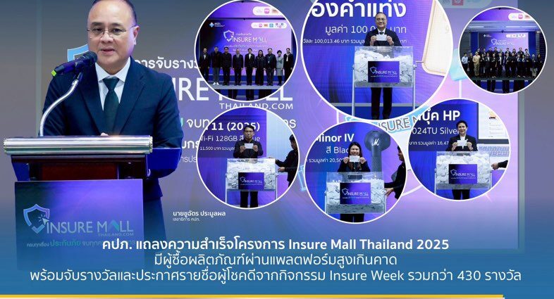 สำนักงาน คปภ. ขอแสดงความยินดีกับผู้โชคดีที่ซื้อผลิตภัณฑ์ประกันภัยในช่วงกิจกรรม Insure Week ผ่านเว็บไซต์ Insure Mall Thailand ระหว่างวันที่ 8 – 21 ธันวาคม 2568 ที่ผ่านมา ที่ได้รับสิทธิ์ลุ้นรางวัลใหญ่มูลค่ารวมกว่า 6 แสนบาท อาทิ ทองคำแท่ง และ iPhone 17 Pro รวมทั้งรางวัลอื่น ๆ อีกมากมาย รวมแล้วมากกว่า 430 รางวัล พร้อมกันนี้ ขอขอบคุณประชาชน ตลอดจนพันธมิตรและบริษัทประกันภัยที่ให้ความสนใจ และร่วมเป็นส่วนหนึ่งของความสำเร็จของโครงการ