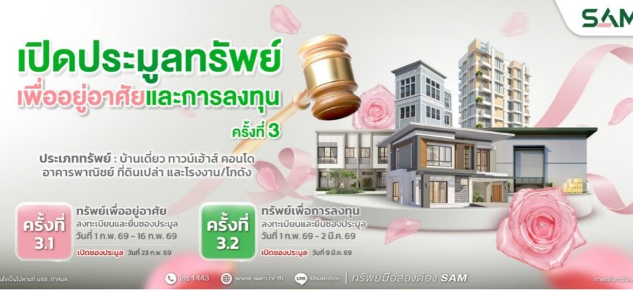 ทั้งนี้ ใน 2569 นี้ SAM ยังคงมุ่งเน้นการเป็นกลไกสำคัญในการบริหารจัดการสินทรัพย์เพื่อขับเคลื่อนเศรษฐกิจของประเทศ โดยการเปิดประมูลในครั้งนี้ได้คัดเลือกทรัพย์มือสองที่มีศักยภาพสูง ตั้งอยู่บนทำเลเด่นทั่วประเทศ มานำเสนอให้กับผู้ที่กำลังมองหาที่อยู่อาศัยและนักลงทุนที่ต้องการขยายธุรกิจ