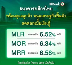 ธนาคารกสิกรไทยเดินหน้าดูแลลูกค้า ลดดอกเบี้ยเงินกู้ หนุนเศรษฐกิจฟื้นตัว มีผล 2 มี.ค. 2569