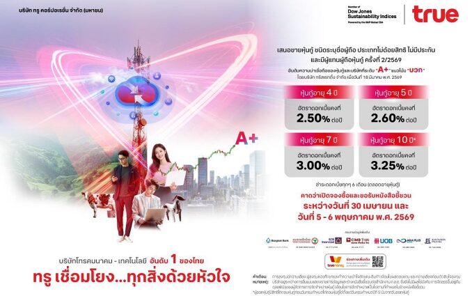 ทรู คอร์ปอเรชั่น ผู้นำโทรคมนาคมเทคโนโลยีของไทย และได้รับการจัดอันดับติด Top 1% บริษัทที่มีความยั่งยืนที่สุดของโลกจาก S&P Global ต่อเนื่องเป็นปีที่ 8 ตามรายงาน Sustainability Yearbook 2026 ตอกย้ำสถานะธุรกิจที่มั่นคงและศักยภาพการเติบโตอย่างยั่งยืนในระยะยาว ท่ามกลางภาวะตลาดการเงินผันผวน นำเสนอทางเลือกการลงทุนคุณภาพสำหรับผู้ลงทุนทั่วไป เตรียมเสนอขายหุ้นกู้ชุดใหม่ จำนวน 4 ชุด อายุตั้งแต่ 4 ปี ถึง 10 ปี ด้วยอัตราดอกเบี้ยคงที่ตั้งแต่ 2.50 – 3.25% ต่อปี จ่ายดอกเบี้ยทุกๆ 6 เดือน ด้วยอันดับความน่าเชื่อถือที่ระดับ “A+” แนวโน้ม “บวก” (Positive) จากบริษัท ทริสเรทติ้ง จำกัด เมื่อวันที่ 18 มีนาคม 2569 สะท้อนความเชื่อมั่นของพื้นฐานธุรกิจที่แข็งแกร่ง รวมถึงบทบาทของทรูในการพัฒนาโครงสร้างพื้นฐานดิจิทัลของประเทศ คาดเปิดจองซื้อระหว่างวันที่ 30 เมษายน และวันที่ 5– 6 พฤษภาคม 2569 ผ่าน 7 สถาบันการเงินชั้นนำได้แก่ ธ.กรุงเทพ ธ.กสิกรไทย ธ.ไทยพาณิชย์ ธ.ซีไอเอ็มบีไทย ธ.ยูโอบี บล.เกียรตินาคินภัทร และ บล.เอเซีย พลัส รวมถึงการขายผ่านแอปพลิเคชัน TrueMoney Wallet โดยมีธนาคารกรุงศรีอยุธยาเป็นนายทะเบียนหุ้นกู้และผู้แทนผู้ถือหุ้นกู้