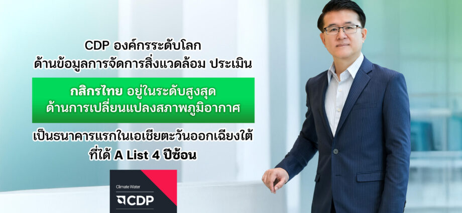 นายจงรัก รัตนเพียร ผู้จัดการใหญ่ ธนาคารกสิกรไทย เปิดเผยว่า ในปี 2568 ธนาคารกสิกรไทยได้รับผลประเมินจาก CDP ซึ่งเป็นองค์กรด้านการประเมินการเปิดเผยข้อมูลการจัดการสิ่งแวดล้อมในระดับโลก ให้อยู่ในระดับสูงสุด A List ในการจัดการและการเปิดเผยข้อมูลด้านการเปลี่ยนแปลงสภาพภูมิอากาศ นับเป็นธนาคารแห่งแรกในเอเชียตะวันออกเฉียงใต้ ที่ได้มาตรฐานผู้นำระดับ A List ติดต่อกัน เป็นปีที่ 4 และปีนี้ยังเป็นครั้งแรกที่ธนาคารได้รับการจัดอันดับให้อยู่ในระดับสูงสุด A List ด้านการบริหารจัดการน้ำ รวมถึงได้รับการจัดอันดับในระดับ A- ด้านการบริหารจัดการป่าไม้ สะท้อนให้เห็นว่าธนาคารได้รับการประเมินให้อยู่ในระดับ Leadership Level ครอบคลุมทั้งมิติการเปลี่ยนแปลงสภาพภูมิอากาศ น้ำ และป่าไม้